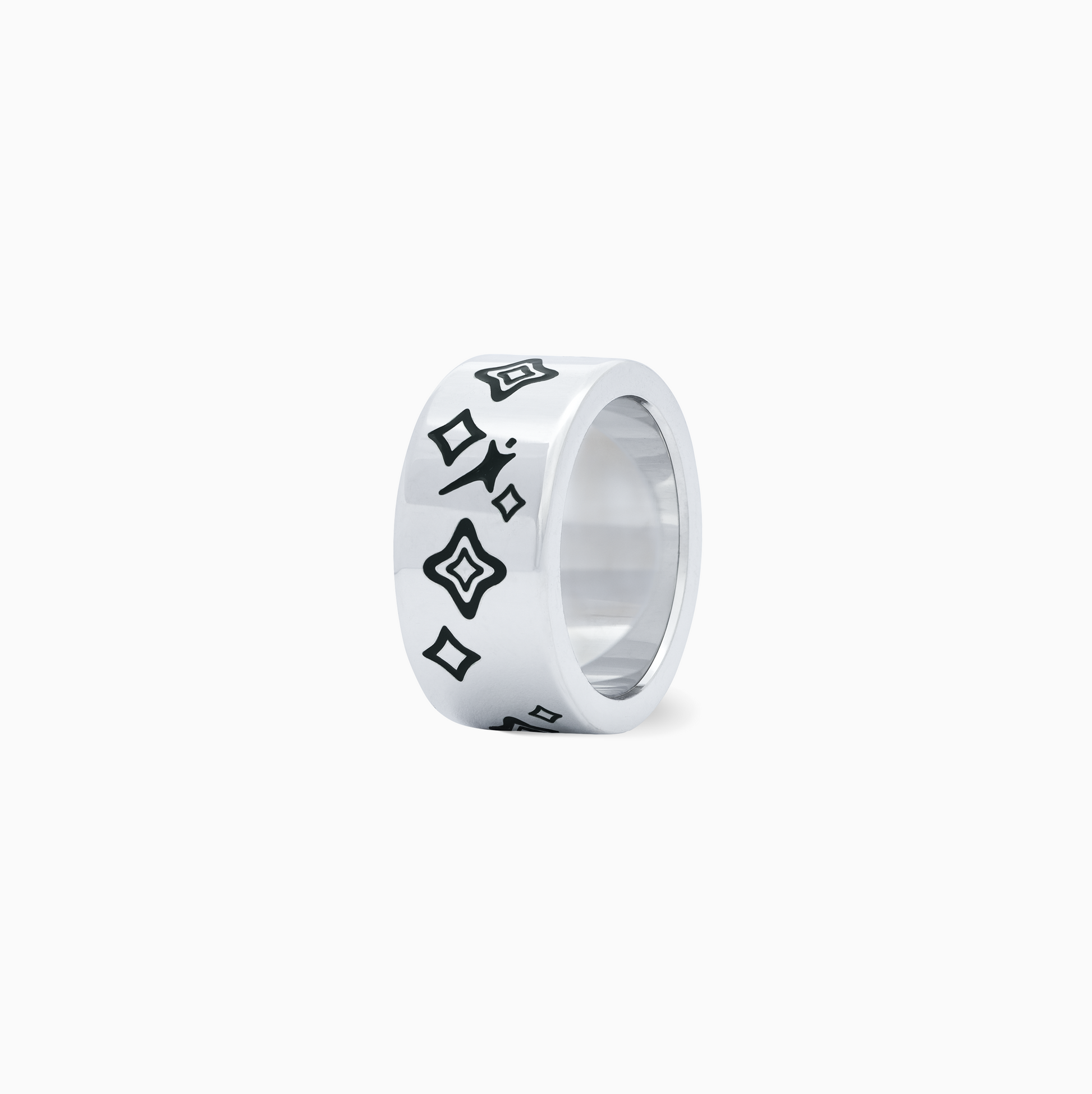 Discover the Stars & Flowers Band ring , a distinctive 10mm wide piece. Adorned with floral and star motifs in black enamel, this ring combines elegance and originality.