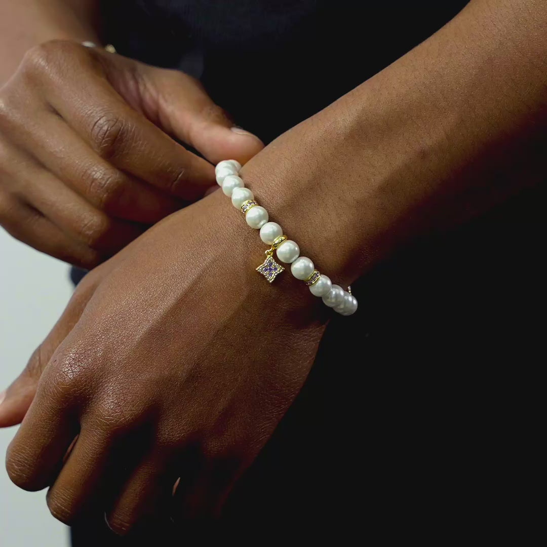 Discover our Flower Pearl bracelet , a delicate piece that combines the elegance of pearls with the finesse of floral details. Composed of 8 mm white pearls, enhanced with a few golden beads, it is adorned with three flowers set with sparkling stones encrusted with purple stones. One of them, suspended as a pendant, brings a touch of grace and movement to the wrist.