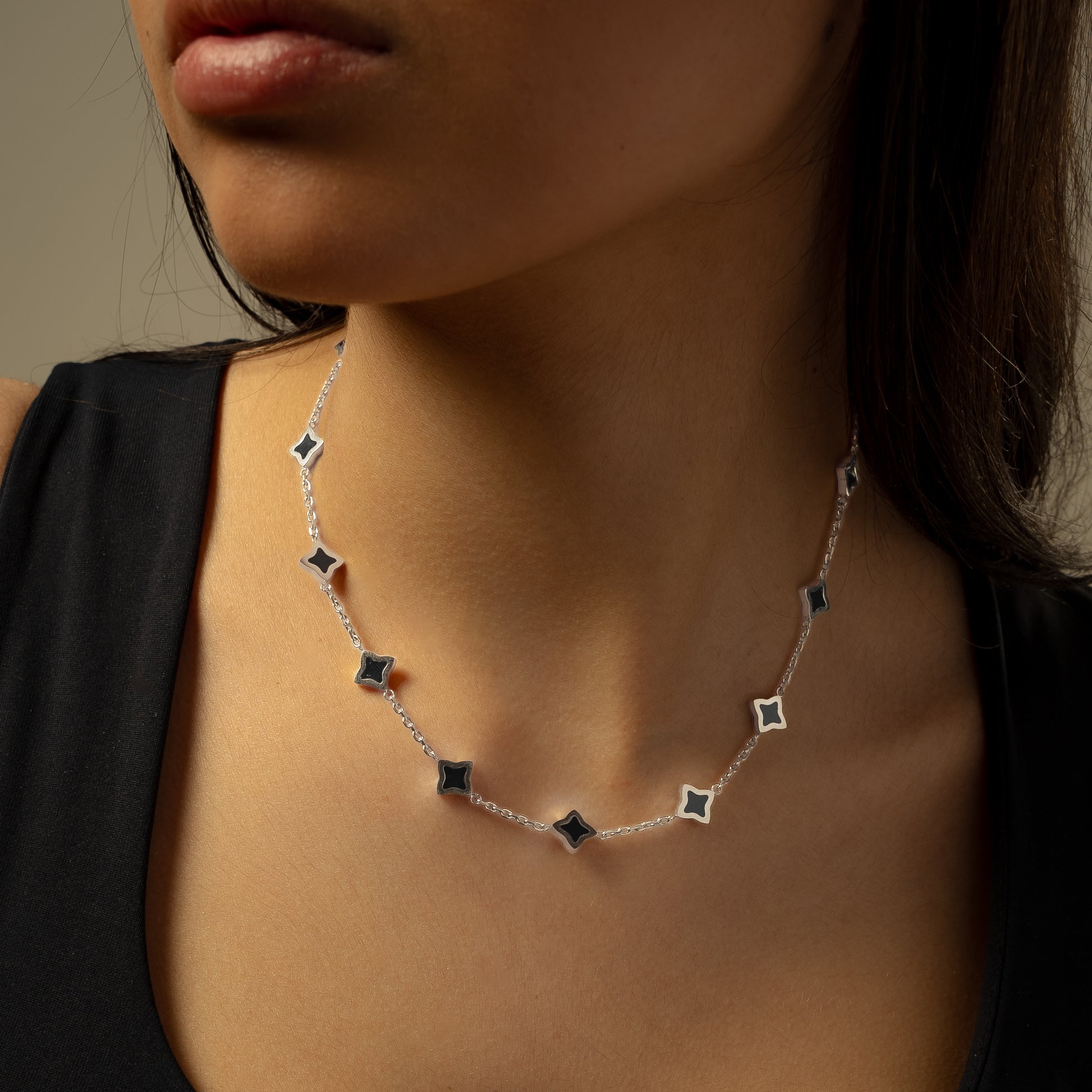 Discover our Flower Chain, an exquisite piece that combines the timeless elegance of a cable chain with the delicacy of flowers. Each flower, adorned with a onyx imitation stone and measuring 8mm in thickness, adds a touch of charm and sophistication to this 2mm chain.