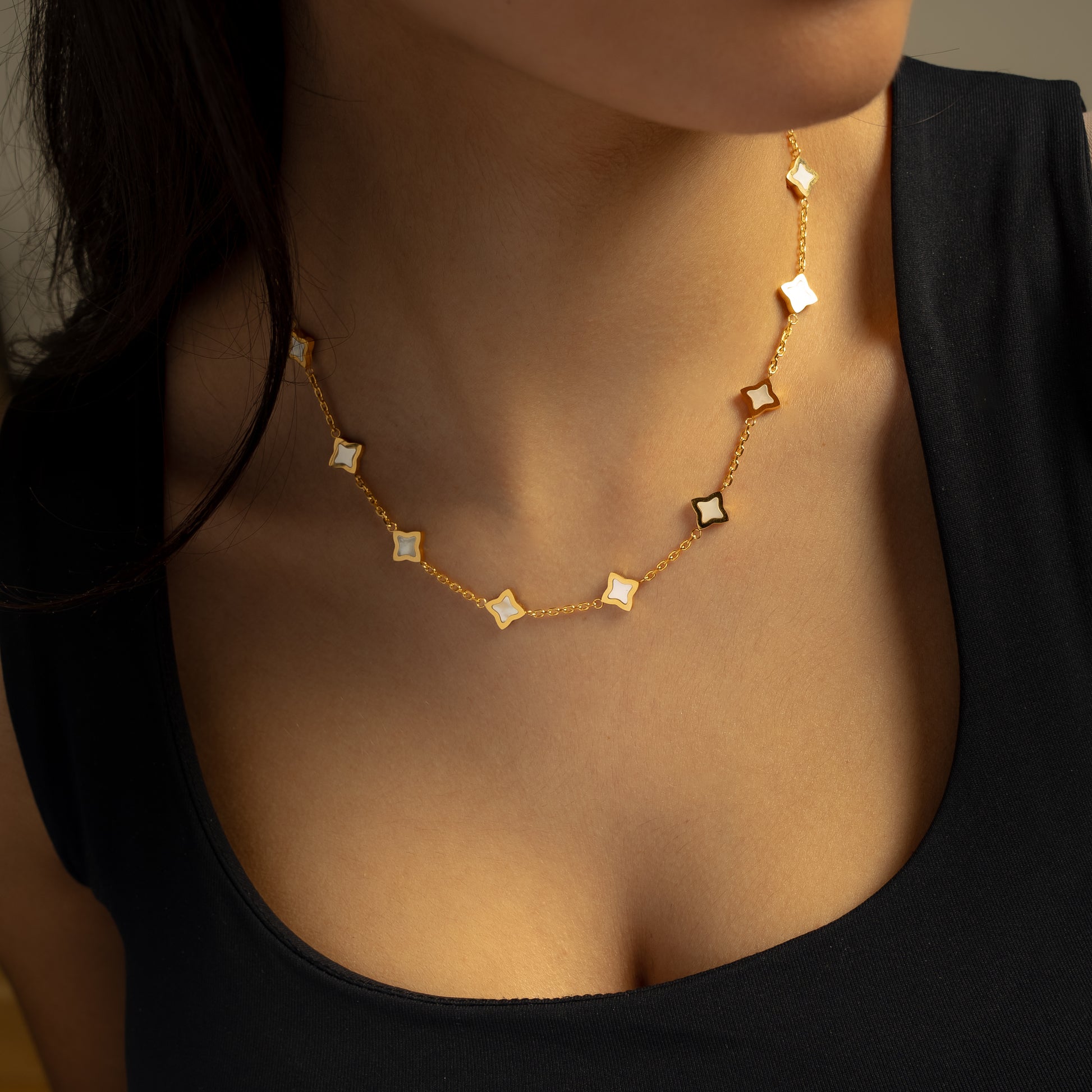 Discover our Flower Chain, an exquisite piece that combines the timeless elegance of a cable chain with the delicacy of flowers. Each flower, adorned with a Mother-of-pearl imitation stone and measuring 8mm in thickness, adds a touch of charm and sophistication to this 2mm chain.