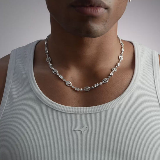 Discover our Signature Iced Chain, a sophisticated piece adorned with our famous circled logo, accompanied by 4mm baguette-shaped stones. This jewel will bring a touch of shine to your style.