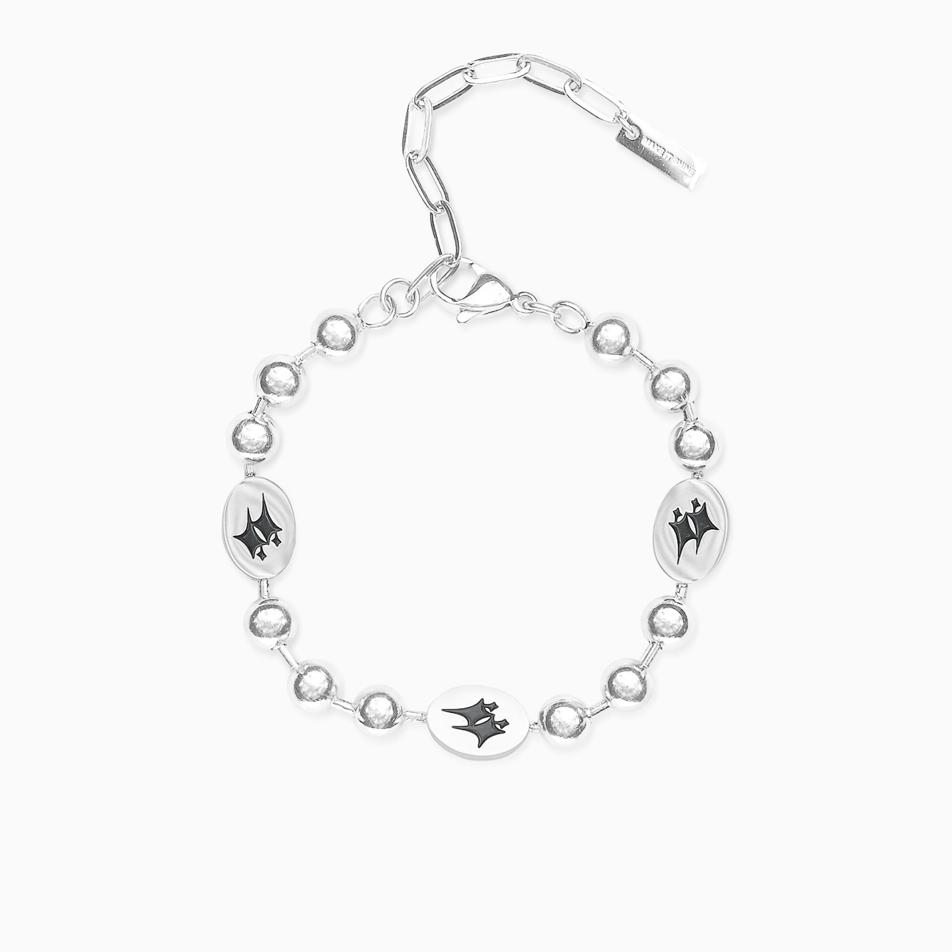 Découvrez notre bracelet Bead Link Signature, une pièce audacieuse qui revisite l’élégance classique avec une touche contemporaine. Conçu en acier inoxydable argenté, il alterne entre beads de 6 mm et pastilles décorées du double logo Make it Shine en peinture émaillée noire, signature emblématique de la Maison.