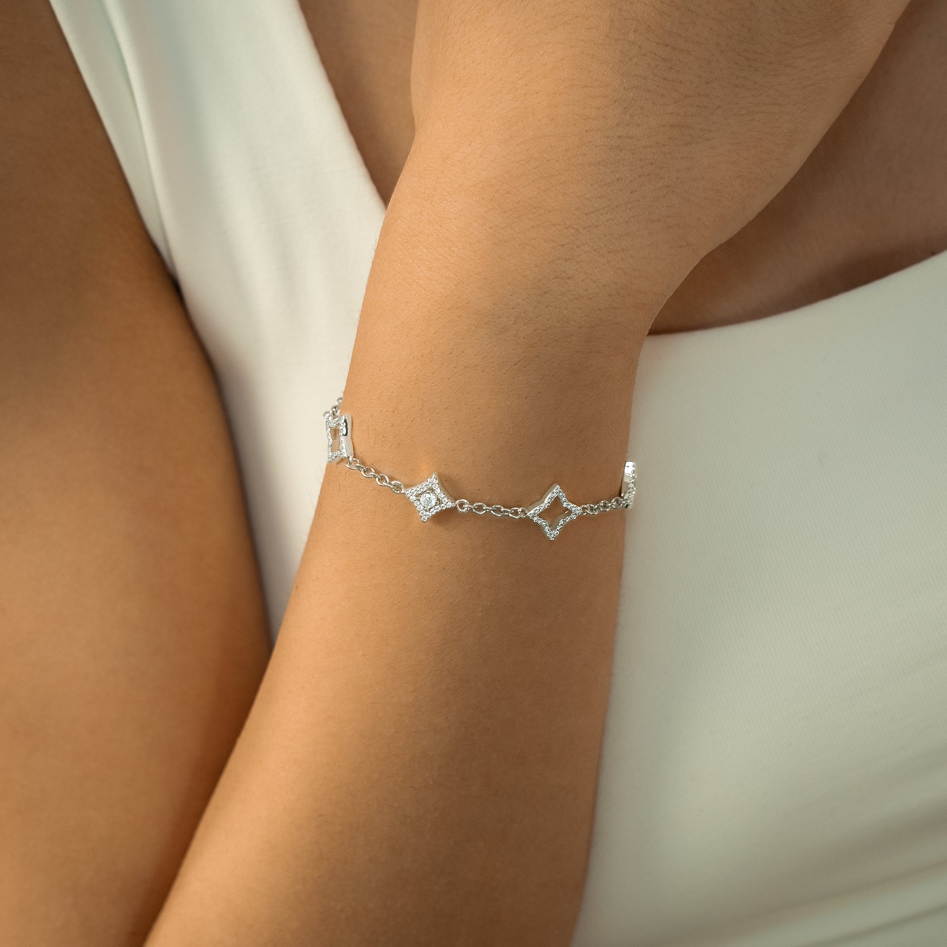 Voici notre Bracelet Mixed Star & Flower, une alliance élégante d'étoiles brillantes et de fleurs délicates. Chaque étoile, ornée d'une pierre scintillante, illumine cette chaîne câble de 3 mm. Les fleurs creuses, agrémentées de pierres étincelantes donne un équilibre parfait entre éclat et raffinement.