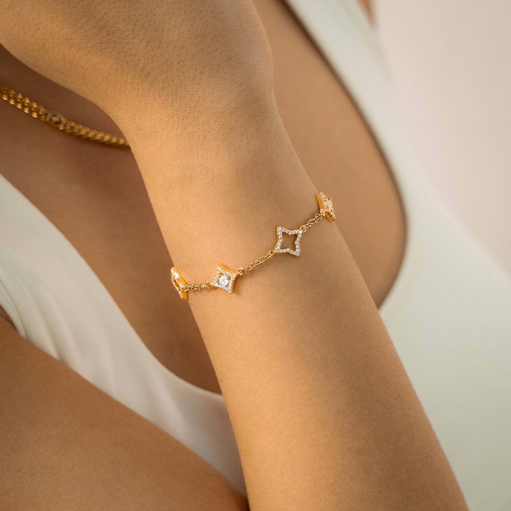 Voici notre Bracelet Mixed Star & Flower, une alliance élégante d'étoiles brillantes et de fleurs délicates. Chaque étoile, ornée d'une pierre scintillante, illumine cette chaîne câble de 3 mm. Les fleurs creuses, agrémentées de pierres étincelantes donne un équilibre parfait entre éclat et raffinement.
