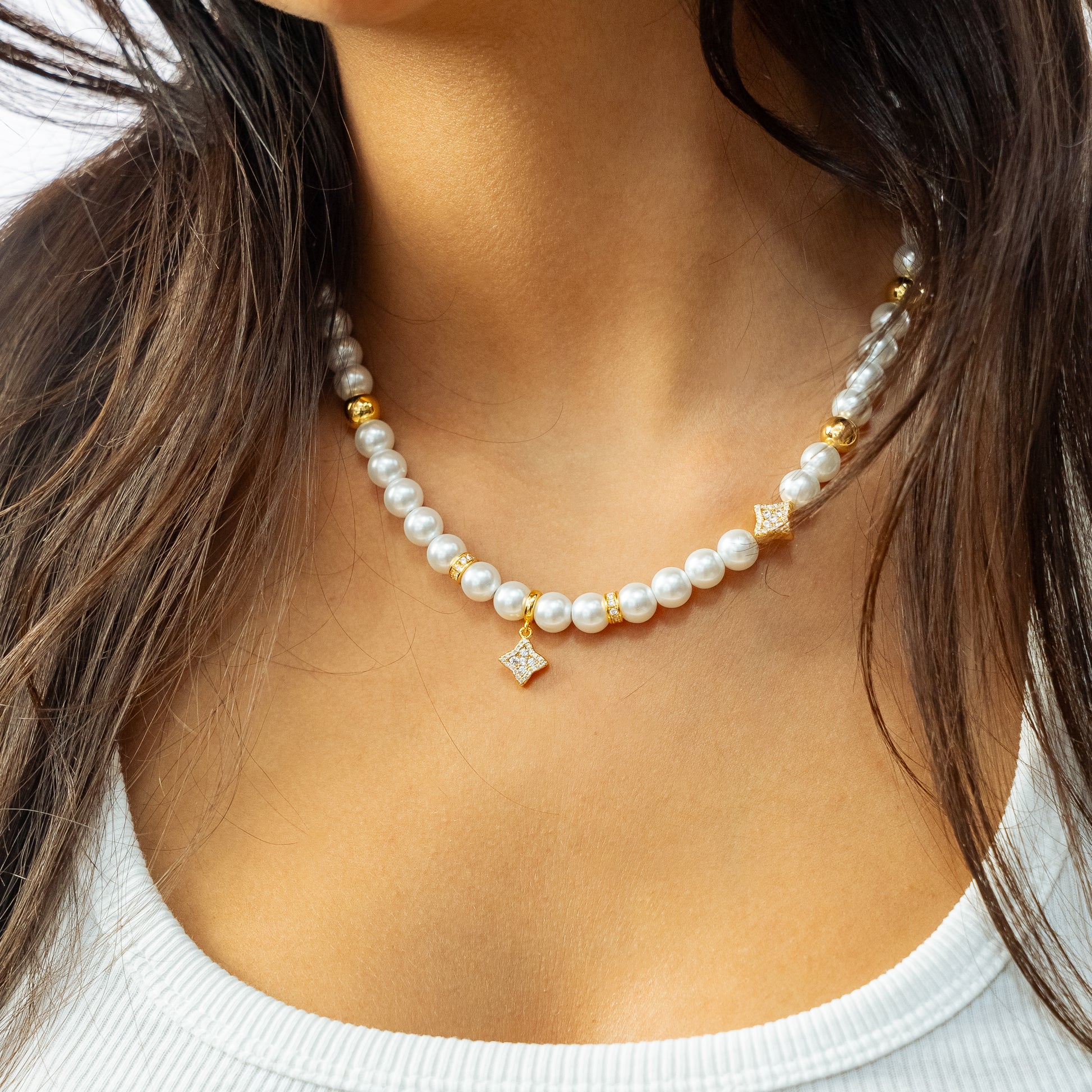 Découvrez notre chaîne Flower Pearl, une pièce raffinée qui allie la douceur des perles à l’éclat de détails floraux. Ornée de perles blanches de 8 mm, ponctuée de quelques perles dorées, cette chaîne se distingue par trois fleurs scintillantes incrustées de pierres blanches. L’une d’elles, suspendue en pendentif, vient sublimer l’ensemble avec une touche aérienne et lumineuse.