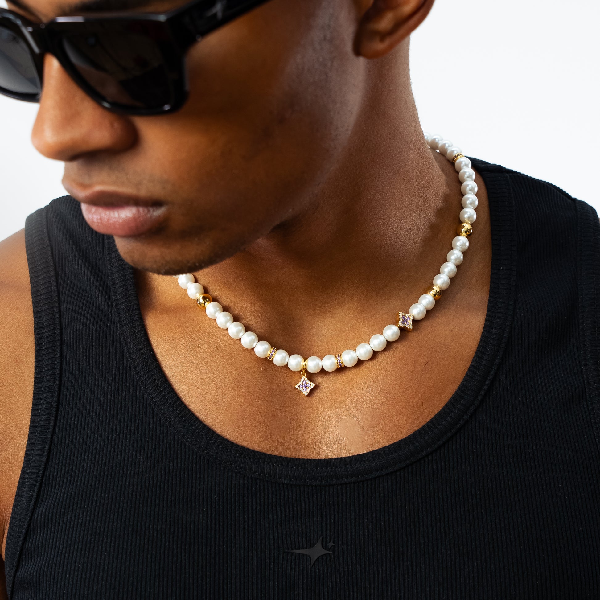 Découvrez notre chaîne Flower Pearl, une pièce raffinée qui allie la douceur des perles à l’éclat de détails floraux. Ornée de perles blanches de 8 mm, ponctuée de quelques perles dorées, cette chaîne se distingue par trois fleurs scintillantes incrustées de pierres violettes. L’une d’elles, suspendue en pendentif, vient sublimer l’ensemble avec une touche aérienne et lumineuse.