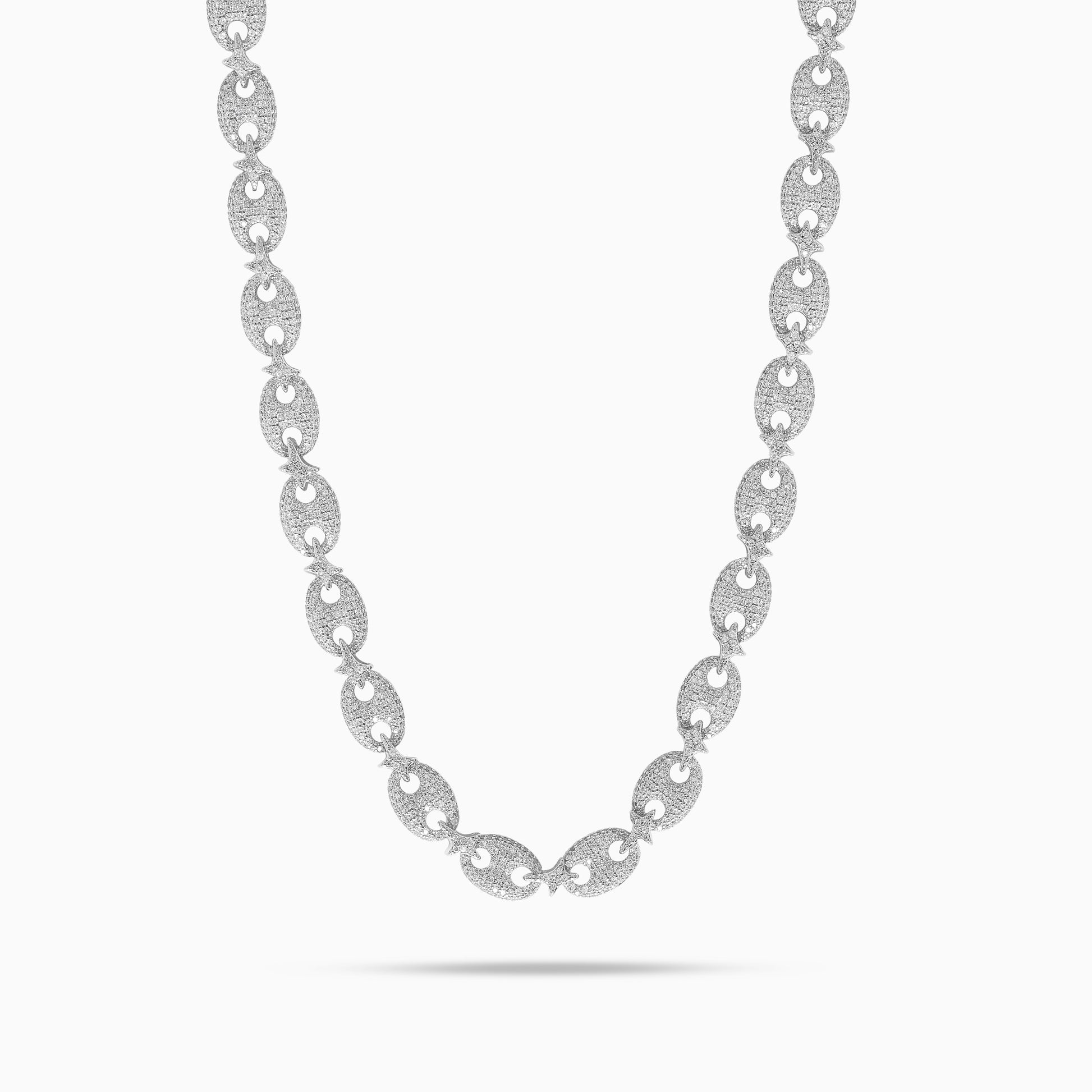 Découvrez notre Chaîne Iced Coffee Beans, inspirée du maillon grain de café. Chaque maillon est entièrement pavé d’oxydes de zirconium pour un éclat intense, et chacun est relié par notre logo Make It Shine, apportant une identité forte et distinctive à la pièce.