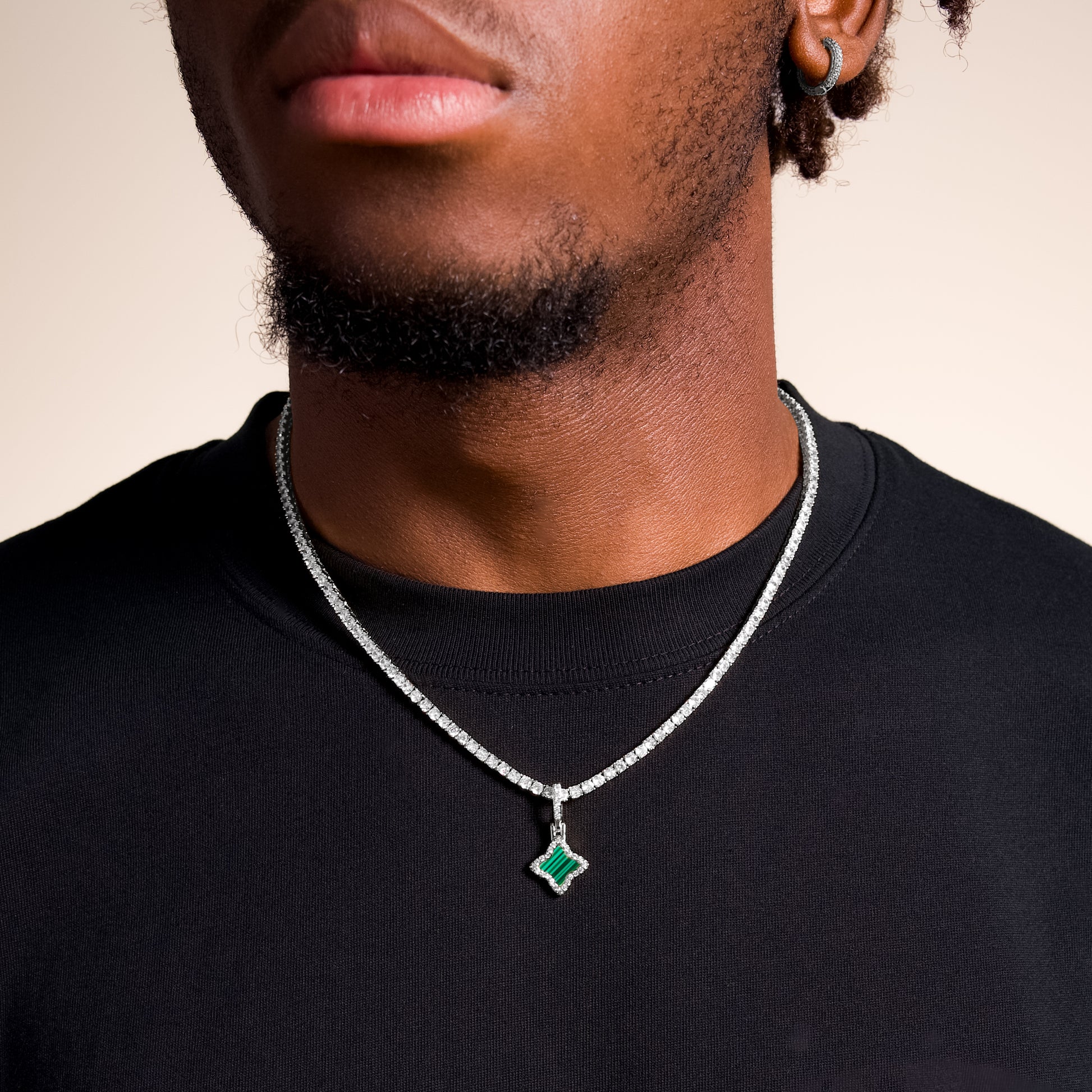 Voici notre pendentif Flower, alliant délicatesse et raffinement intemporel. Au cœur de ce bijou, une fleur sertie de pierres scintillantes met en valeur une pierre centrale en imitation malachite, le tout offrant une épaisseur de 8 mm pour un charme subtil et lumineux.
