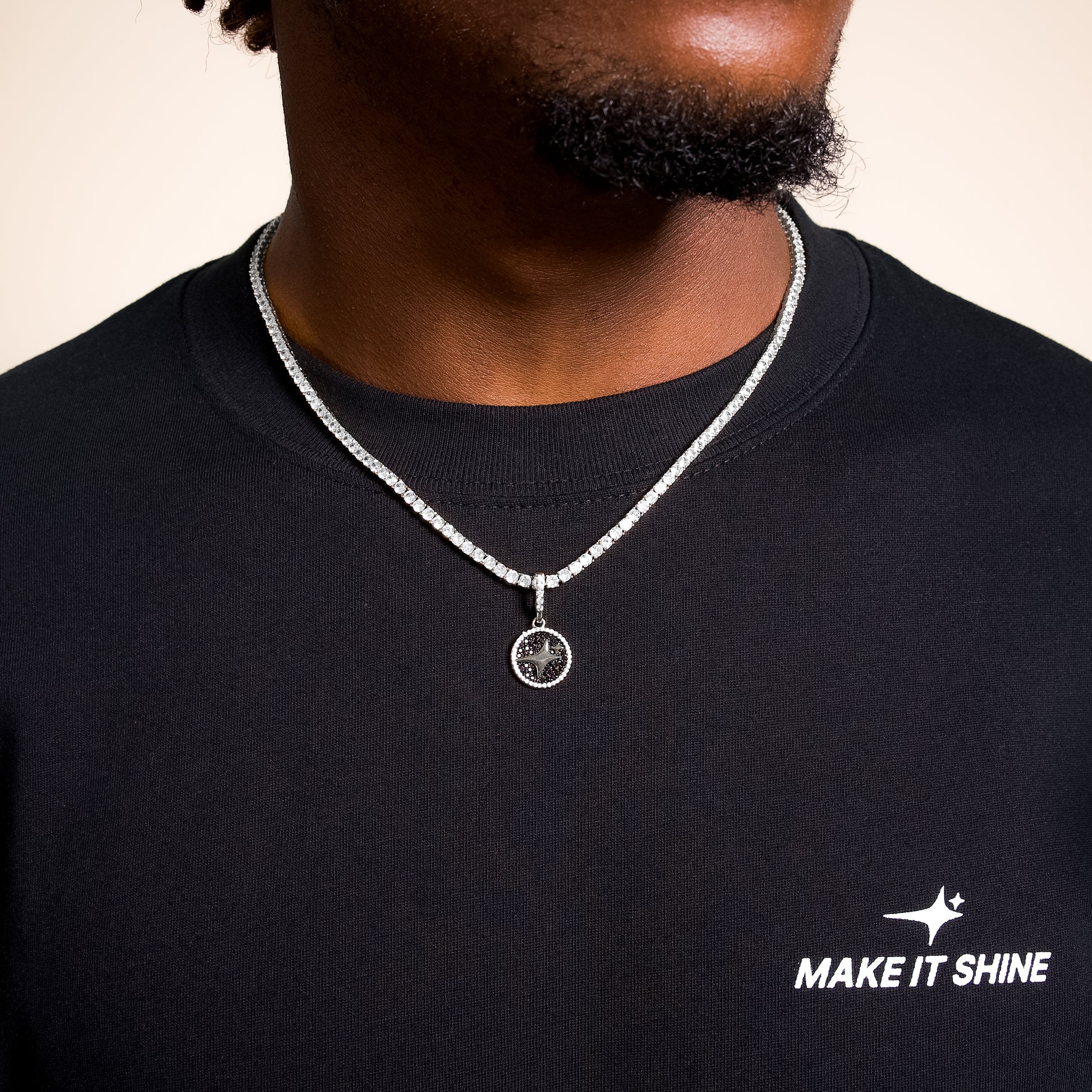 Découvrez notre médaillon Signature, un bijou éclatant qui sublime notre célèbre logo étoilé. D'un diamètre de 1,5 cm, ce pendentif raffiné est orné d'oxydes de zirconium noirs et blancs étincelants, mettant en lumière notre étoile au centre. Parfait pour ajouter une touche de sophistication et de brillance à vos tenues.