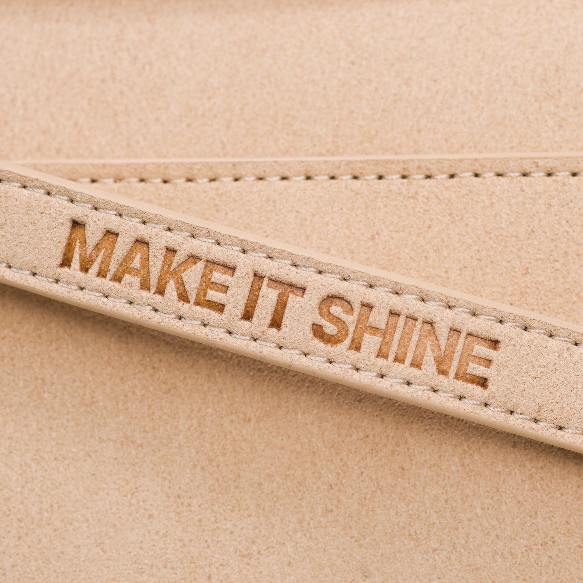 Logo Make it Shine embossé sur la sacoche et sur la bandoulière