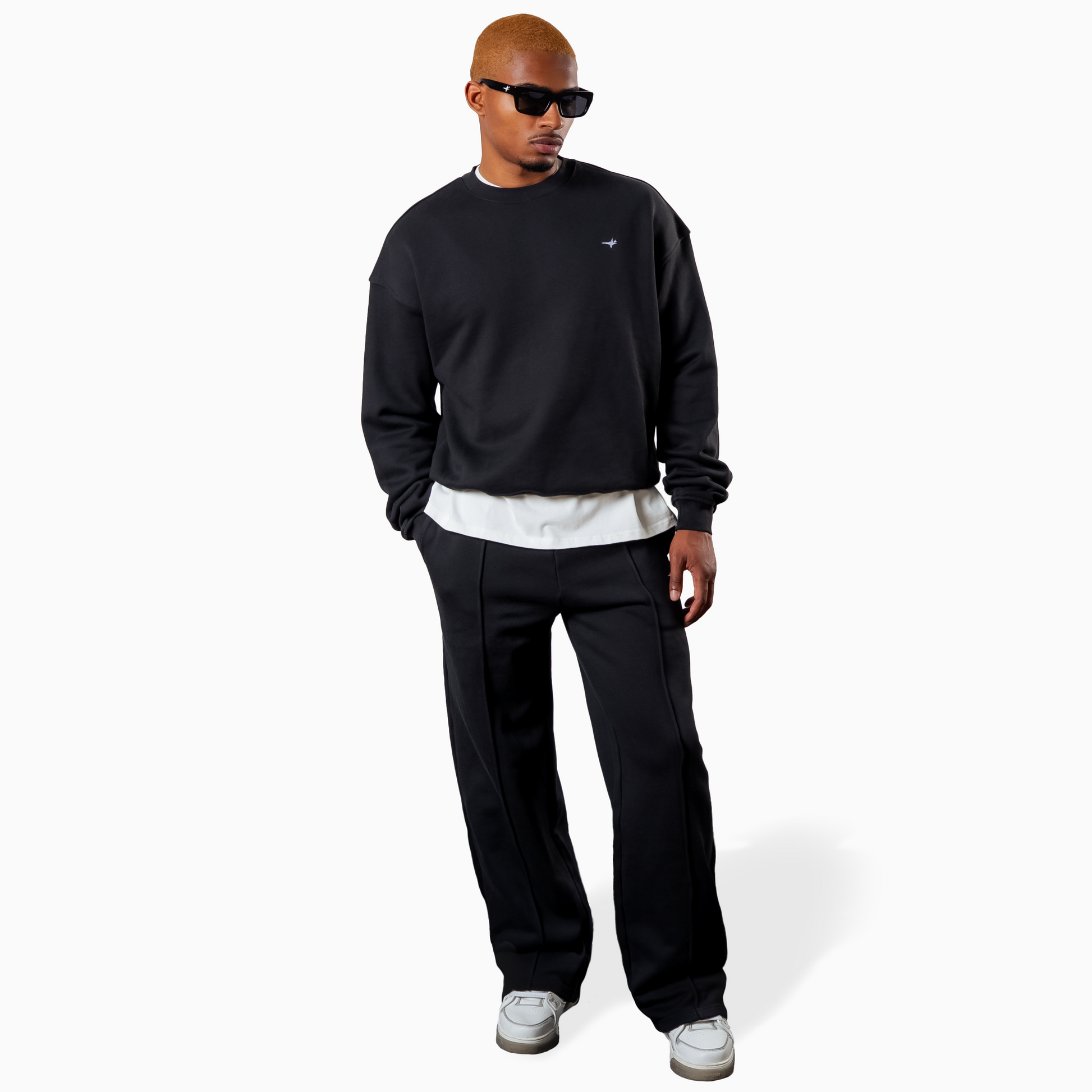 Sweatpant noir en jersey épais avec une coupe ample et confortable, confectionné en 100% coton de qualité supérieure. Doté de poches latérales pratiques et d’une taille élastique avec cordons de serrage internes pour un ajustement optimal.