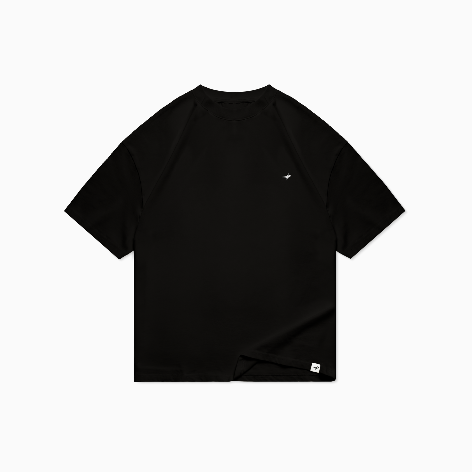 T-shirt noir en jersey à manches courtes avec une coupe oversize, confectionné en coton épais. Col ras de cou côtelé.